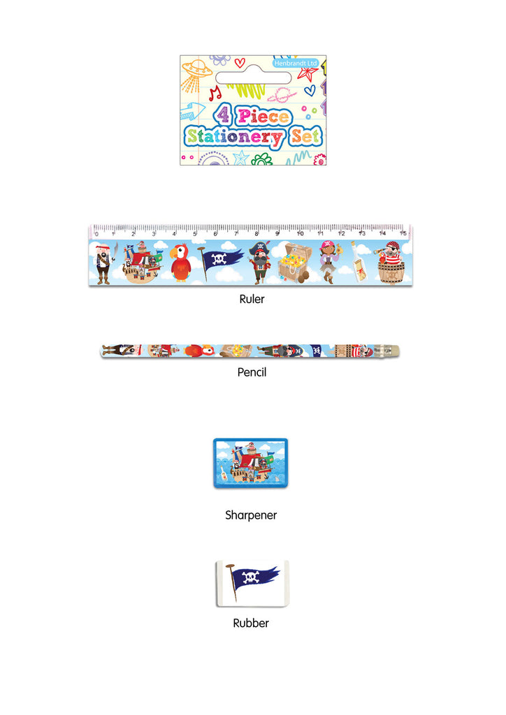 Pirate stationery set comprised of 1 pencil with eraser top, 1 sharpener, 1 eraser, 1 ruler