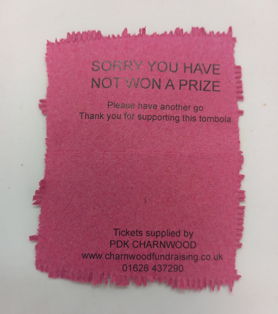 These losing tombola tickets are easy to tear with perforated tear-off edges, each reading "SORRY YOU HAVE NOT WON A PRIZE".