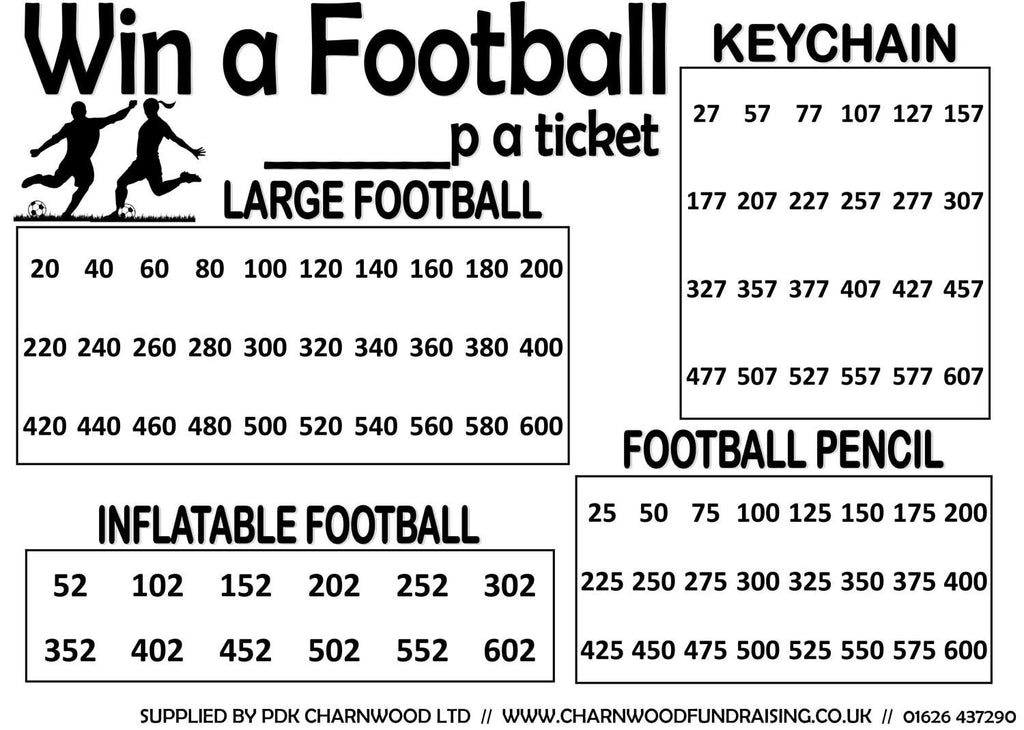 Score a goal with this winning fundraiser! With 78 football themed prizes and a suggested ticket price of only 25p, your customers will score with a fantastic prize if they pick a winning ticket.